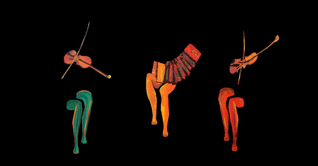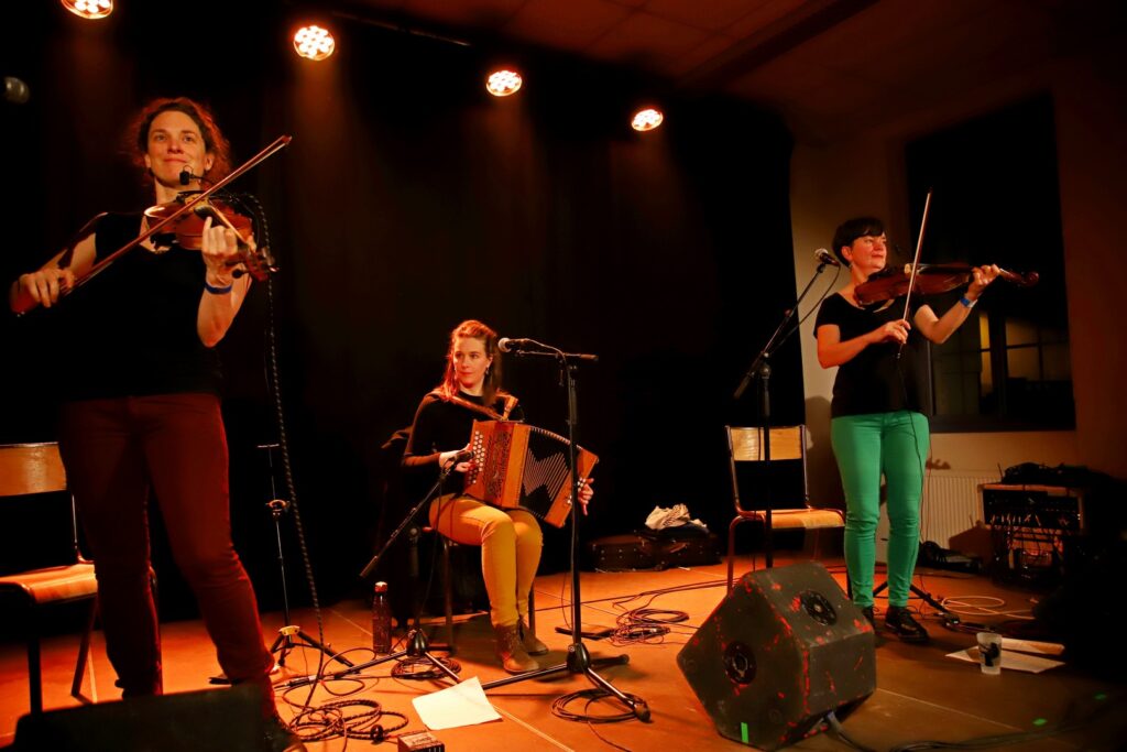 Retour au Line Up 3 PAS D’ICI Bal folk Nina Lachia et Lucile Marsac violons 5 cordes, chant, Marie Peyrat accordéon diatonique, chant BAL FOLK Samedi 14 février 2026 21h | L’Esquisse Réserver pour cette soiréeRunning Order 3 musiciennes proposent un bal varié avec des danses folk généralistes et une bonne touche de danses du Poitou, avec des détours par le Morvan et l’Auvergne, leur 3 régions d’origine ! 3 artistes pas d’ici mais un peu quand même, qui ont pour mission de nous faire tourner sur le parquet de l’esquisse jusqu’au lendemain.3 musiciennes qui vont nous envoyer de bourrées en maraîchines, de branles en avant-deux, de scottishs en polkas avec brio ! Retour au Line Up